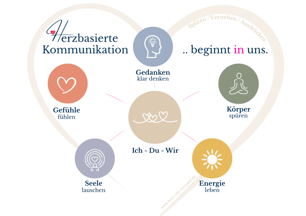 Herzbasierte Kommunikation verbindet Herz und Verstand und beginnt dort, wo wir uns selbst wahrnehmen. Sie findet auf fünf Ebenen statt: in unseren Gedanken und Gefühlen, in unserem Körper, auf seelischer Ebene und in unserer Energie.